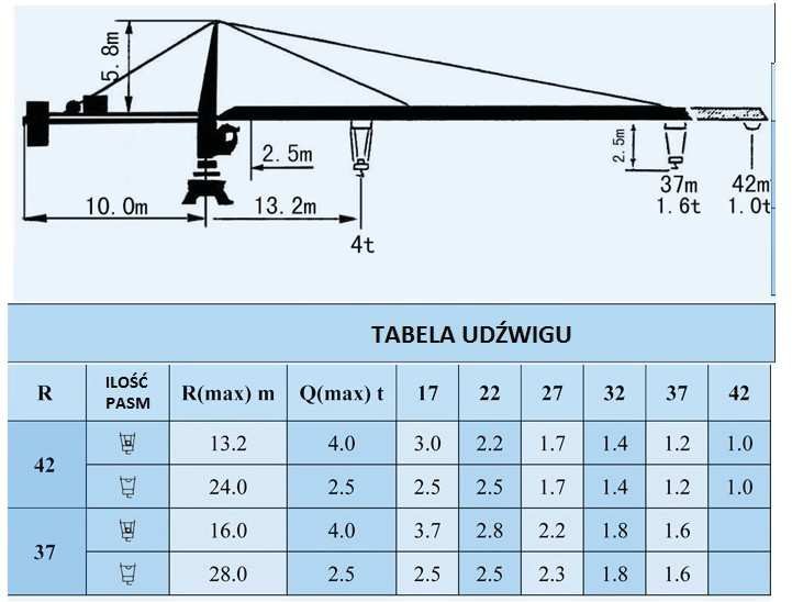 Maksymalna masa podnoszonego ładunku przy kącie β wynoszącym 40° nie może przekraczać: