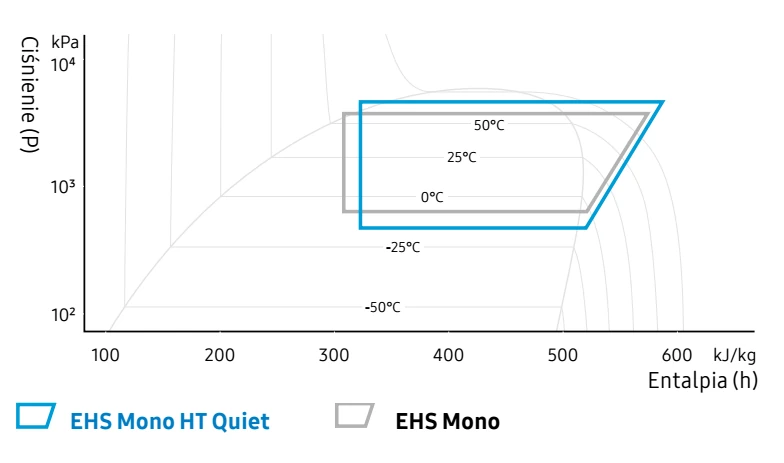 *Stopień sprężania = Ciśnienie tłoczenia/Ciśnienie ssania. Na podstawie wewnętrznych testów jednostki zewnętrznej EHS Mono HT Quiet w porównaniu z konwencjonalną jednostką zewnętrzną EHS. W rezultacie ciśnienie po stronie tłocznej wzrosło z 43 do 55 kgf/cm²G, a stopień sprężania wzrósł z 13 do 17.
